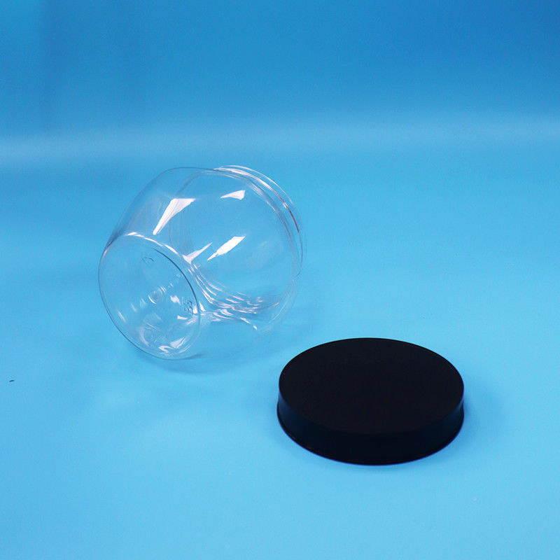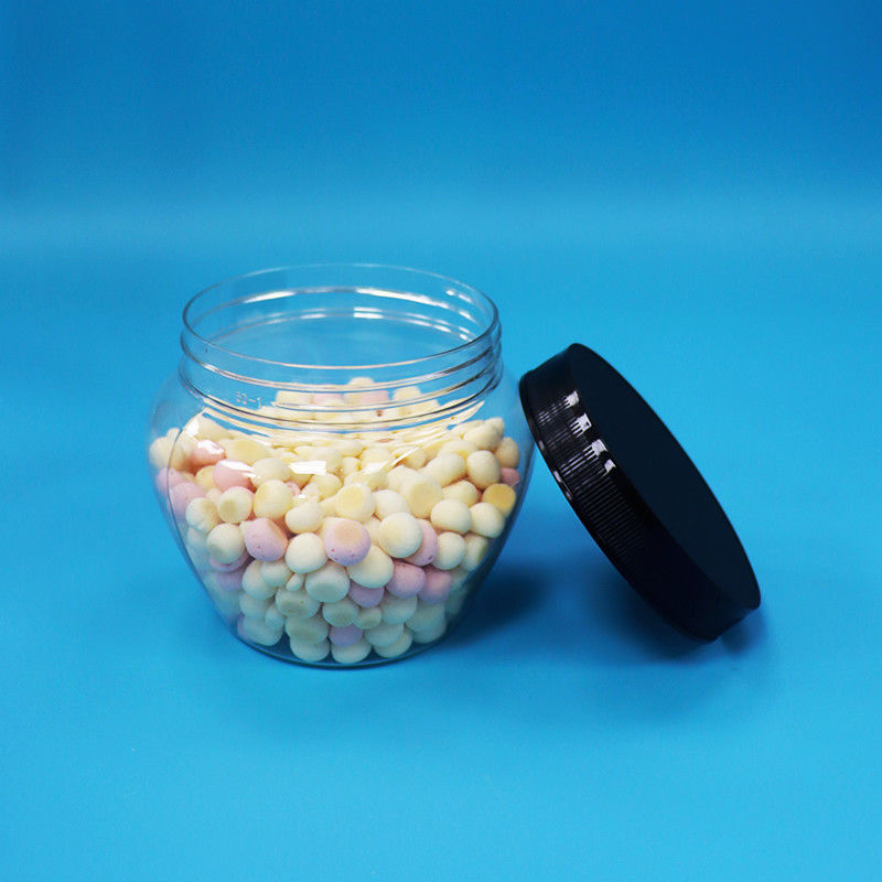 Versiegelter, transparenter, einzigartig geformter Kunststoff-PET-Bonbon- und Lebensmittelkeksbehälter mit schwarzem Kunststoffdeckel