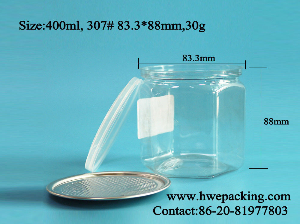 Dieses ist Plastik-HAUSTIER #307 Dosen, die, nachdem Sie die Snack-Food-Produkte in den Dosen füllten, der Aluminium-EOE-Deckel (einfacher Deckel der offenen Enden) die versiegelnde Maschine benötigen, den Deckel zu versiegeln, wir liefern die Matchdichtungsmaschine für Kunden auch wenn Bedarf. Wir bieten an, dass Plastikaufreißlaschedosen, die ungefähr 400 ml-Wasserkapazitätsprodukte in den Dosen halten konnten und diese Aufreißlasche Leck Beweis und 100% einmacht, die luftdicht sind.